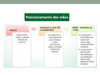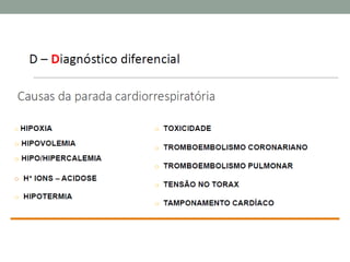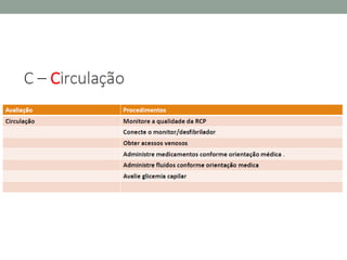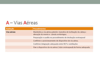 O documento descreve os procedimentos de assistência de enfermagem em parada cardiorrespiratória (PCR), incluindo a definição de PCR, a cadeia de sobrevivência, a vigilância e prevenção, os componentes de uma reanimação cardiopulmonar de alta qualidade, as drogas utilizadas, a avaliação secundária e os cuidados pós-PCR.