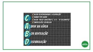 O documento descreve os procedimentos para parada cardiorrespiratória (PCR), incluindo identificar uma PCR, sintomas que precedem, ressuscitação cardiopulmonar (RCP) em equipe, iniciando RCP, lesão cerebral após PCR, drogas usadas e cuidados pós-PCR.