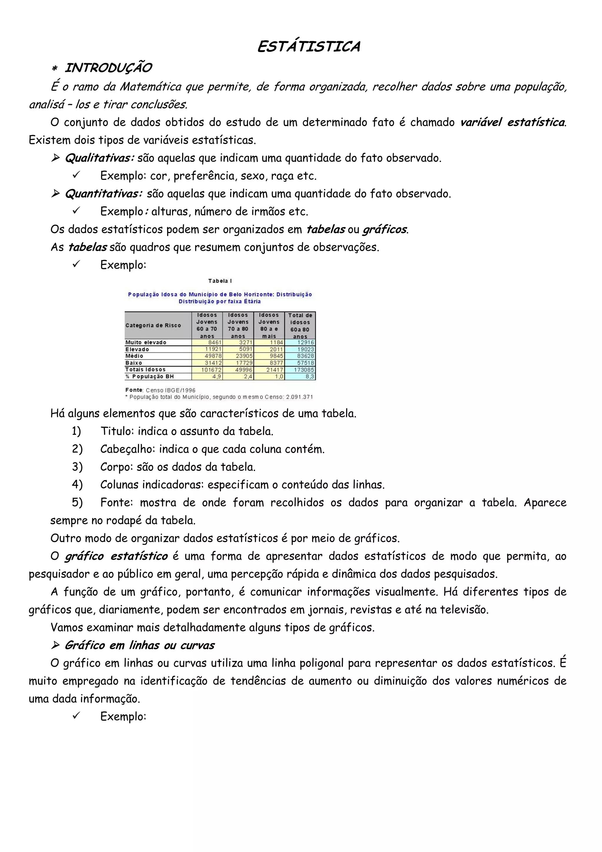 O documento descreve os conceitos básicos de estatística, incluindo variáveis estatísticas, tabelas, gráficos estatísticos comuns como barras e setores, e medidas como frequência absoluta, frequência relativa e frequência acumulada.