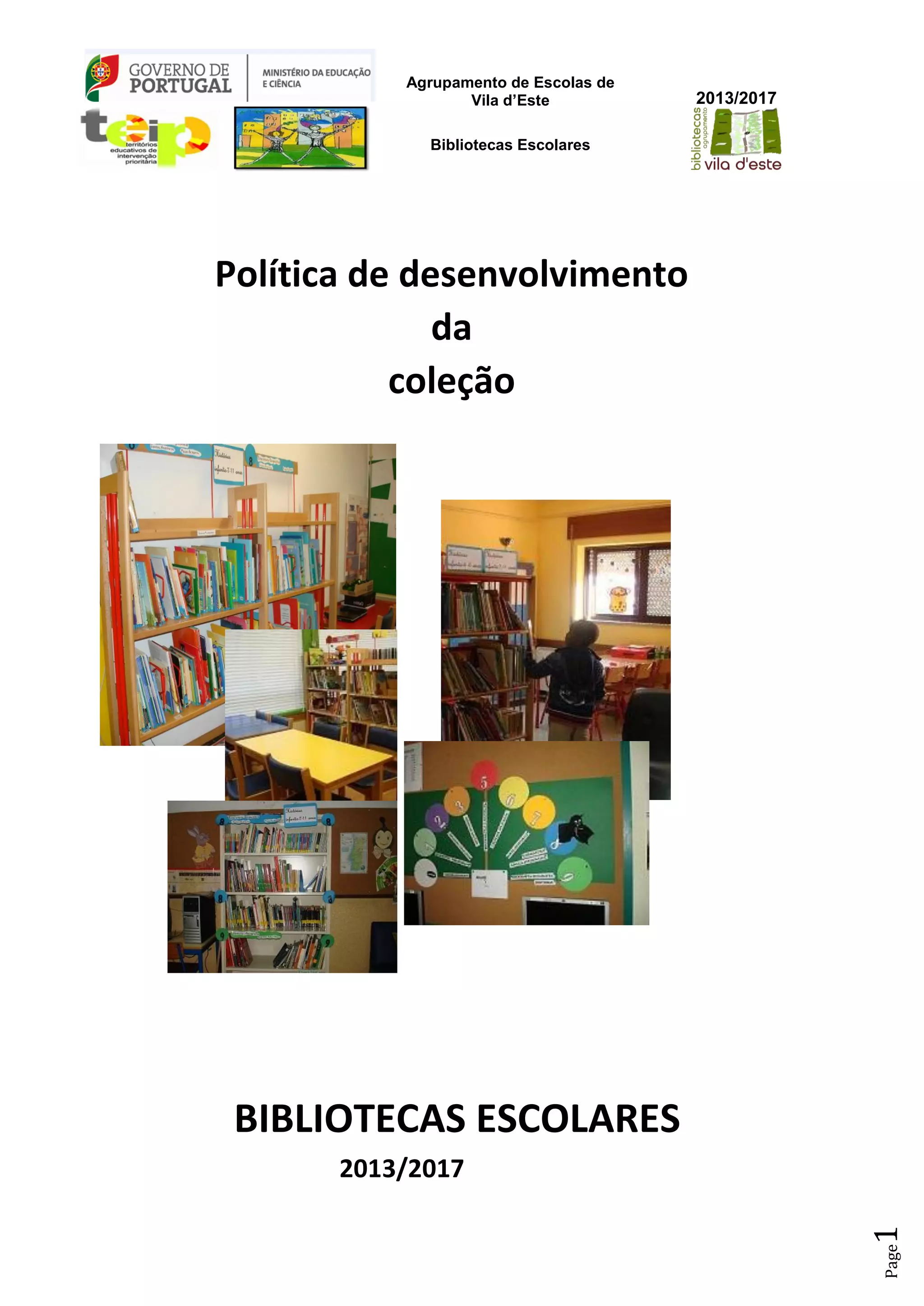 Este documento define as políticas e critérios para o desenvolvimento da coleção das bibliotecas escolares de um agrupamento, incluindo a seleção, aquisição, organização e preservação dos recursos. Estabelece os princípios de liberdade intelectual e igualdade de acesso, considerando as necessidades dos utilizadores e o currículo. Fornece critérios específicos para diferentes tipos de materiais como ficção, não ficção, obras de referência e recursos eletrónicos.
