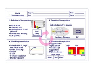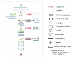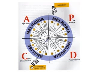 O documento descreve o Ciclo PDCA, um método de melhoria contínua de processos criado por Walter Shewhart e disseminado por Deming. O Ciclo PDCA consiste em quatro etapas: Planejar (Plan), Executar (Do), Verificar (Check) e Agir (Action). Também apresenta fluxogramas como ferramenta para representar graficamente os passos de um processo.