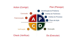 O documento aborda o treinamento de identificação de problemas utilizando a abordagem PDCA, detalhando métodos como diagrama de causa e efeito e a técnica dos 5 porquês. Destaca a importância de uma análise colaborativa para criar planos de ação eficazes e a necessidade de controle do processo após a implementação. Conclui com a enfatização da padronização e incorporação de melhorias nas rotinas do negócio.