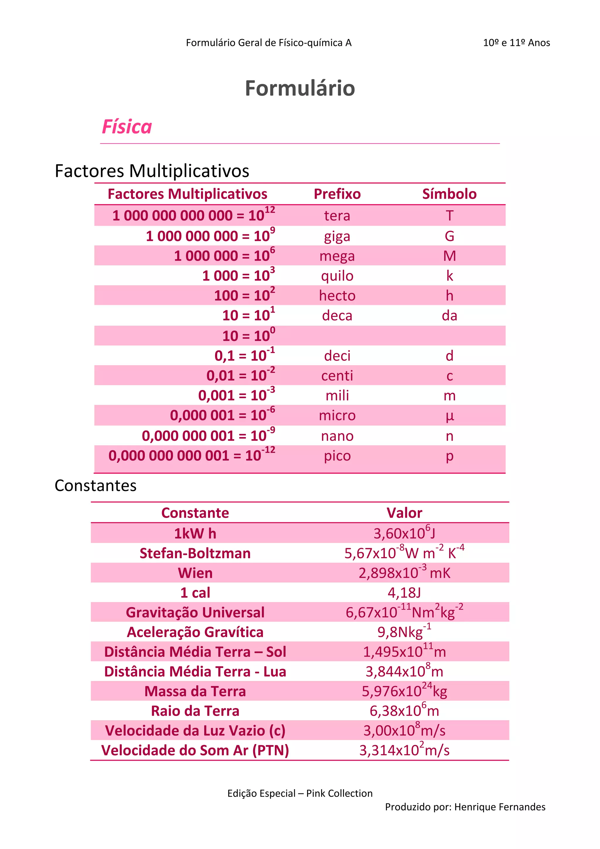 1) O documento apresenta várias constantes e fórmulas fundamentais de física e química, incluindo fatores multiplicativos, leis da termodinâmica, mecânica newtoniana e eletromagnetismo.