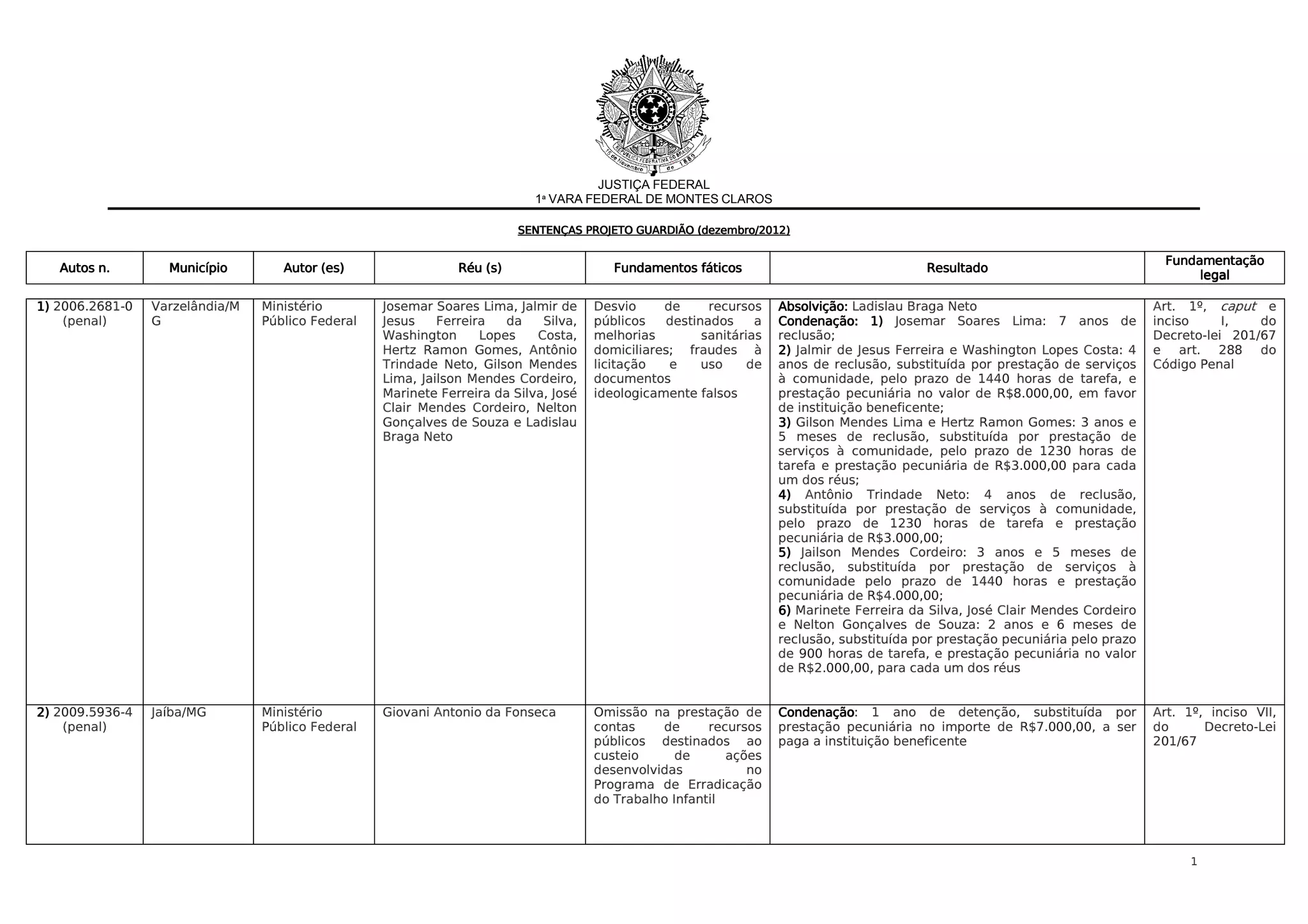 O documento resume 5 processos judiciais da 1a Vara Federal de Montes Claros sobre desvio de recursos públicos. Os réus foram condenados ou absolvidos por crimes como desvio de verba, fraude e omissão em prestar contas de projetos de saúde, saneamento e combate à pobreza com penas que incluíram reclusão, prestação de serviços e multas.