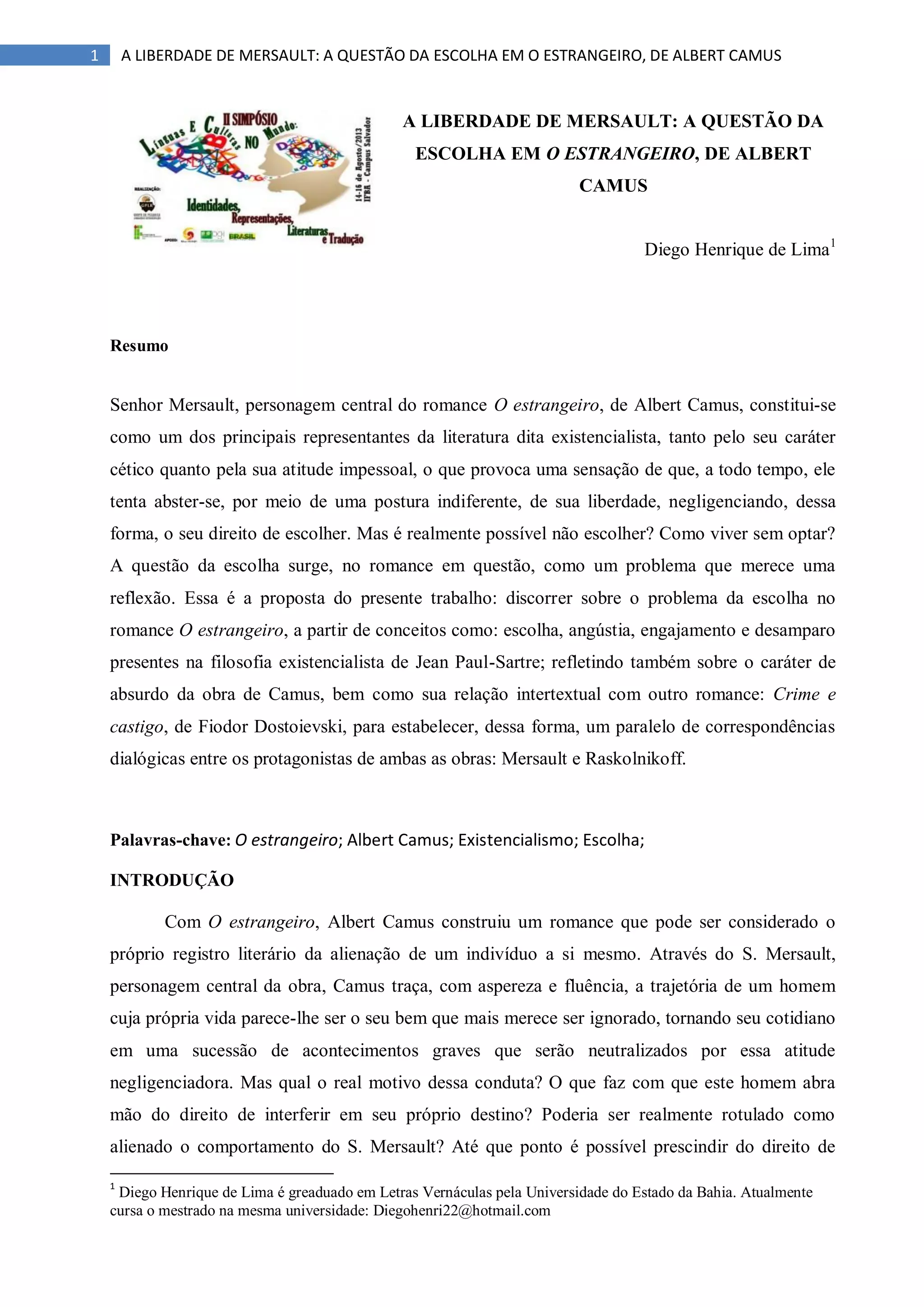 1. O documento analisa a questão da escolha na obra O Estrangeiro, de Albert Camus, através do personagem central Mersault.