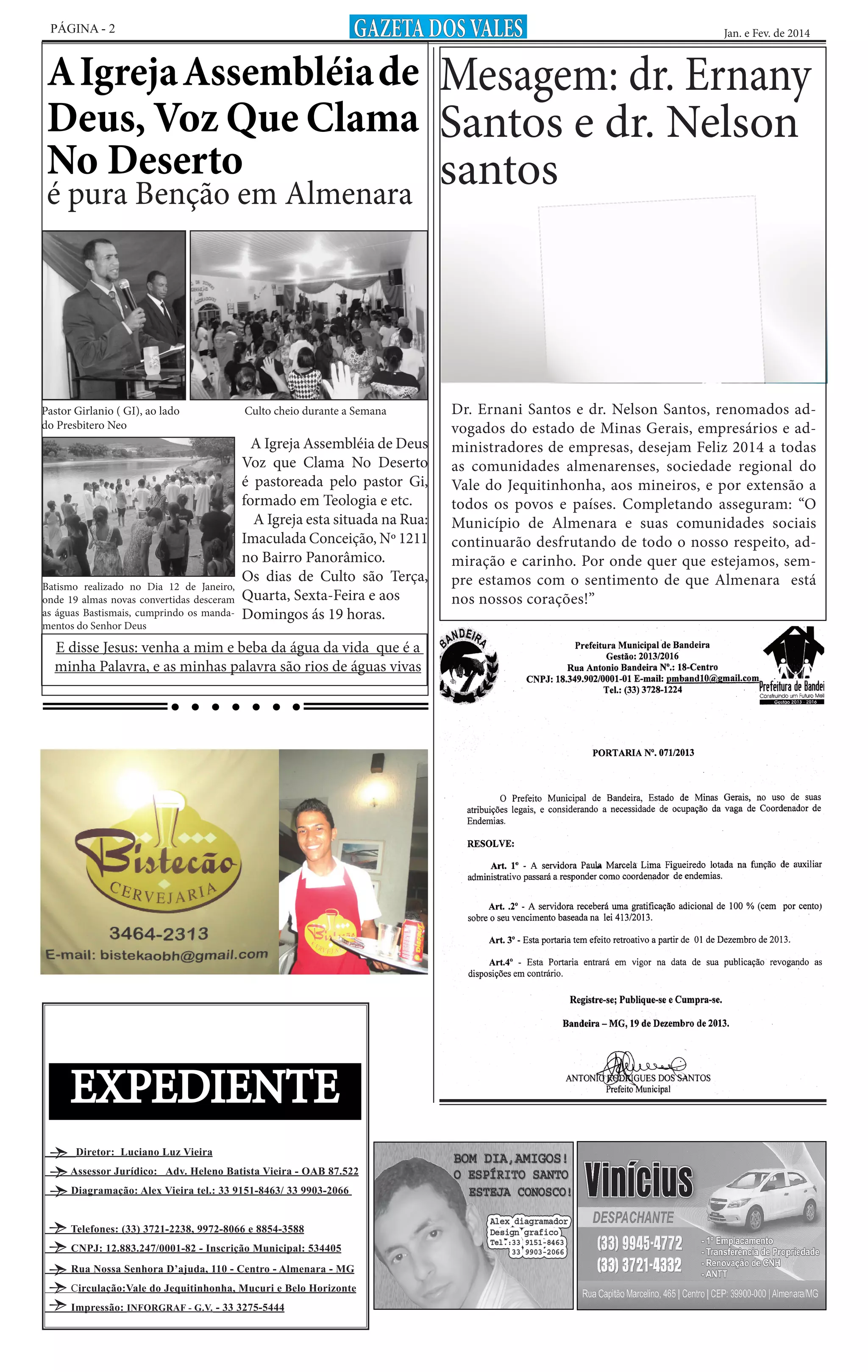 O documento relata sobre eventos religiosos e jurídicos em Almenara, MG. A Igreja Assembléia de Deus Voz que Clama no Deserto realizou um batismo de 19 pessoas. O advogado Heleno Vieira obteve êxito em julgamento em Belo Horizonte. O advogado Dr. Aníbal Filho recebeu a Medalha Desembargador Hélio Costa na Câmara Municipal de Almenara.