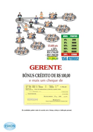 O documento descreve a empresa ESKON, que vende produtos de higiene pessoal, limpeza e utilidades domésticas através de marketing multinível. A ESKON oferece um plano de incentivos que permite que os distribuidores ganhem uma renda extra ao indicarem novos membros e recebam bônus com base em sua rede de indicações. O documento explica como funciona o sistema de pontuação e bônus da ESKON.