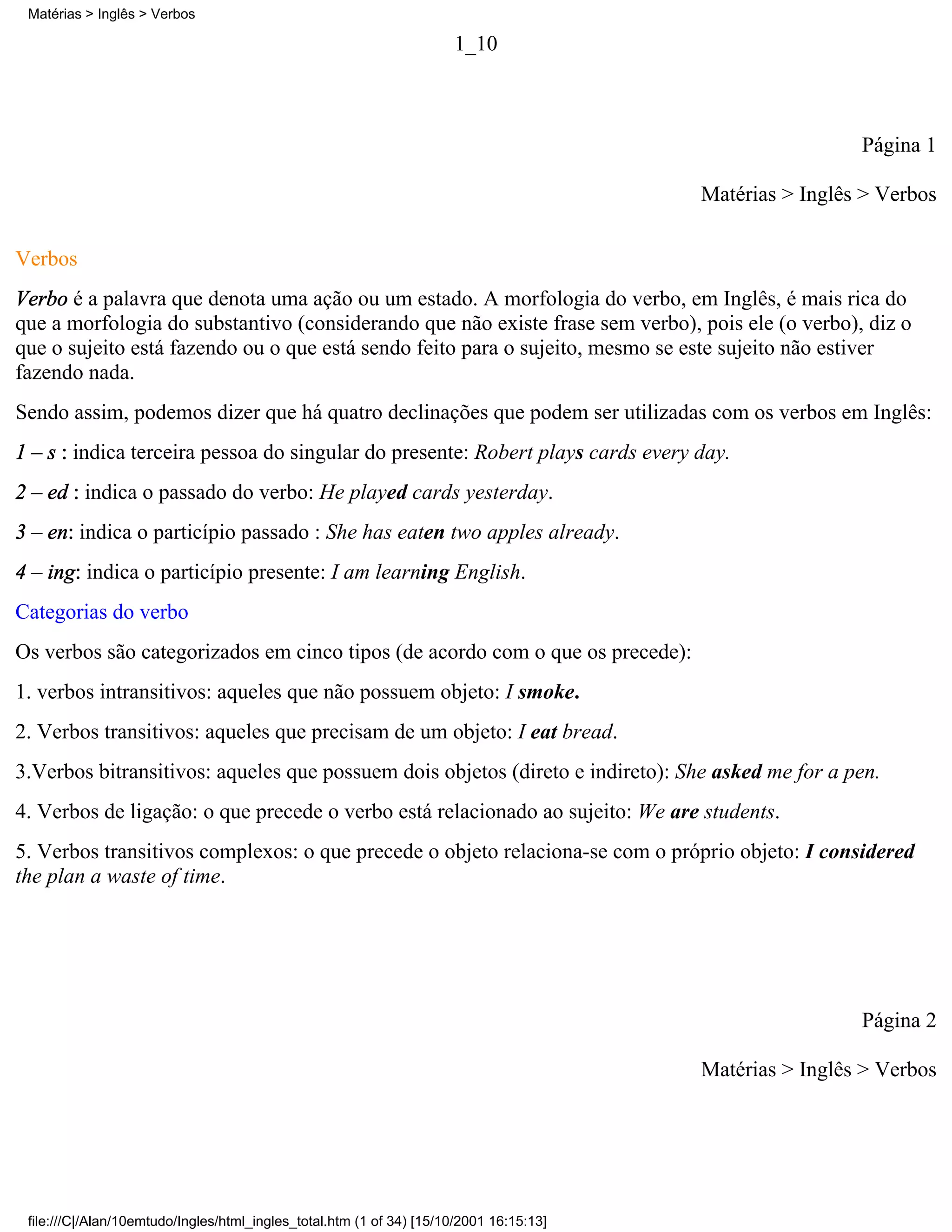 O documento discute os verbos em inglês, incluindo suas categorias, tempos verbais e modais. É explicado que verbos indicam ações ou estados e possuem quatro declinações principais. Além disso, são apresentadas as cinco categorias de verbos e detalhes sobre os tempos e aspectos verbais como o presente simples, passado simples, presente progressivo, entre outros. Por fim, há uma breve discussão sobre os verbos modais como can, could e able to.