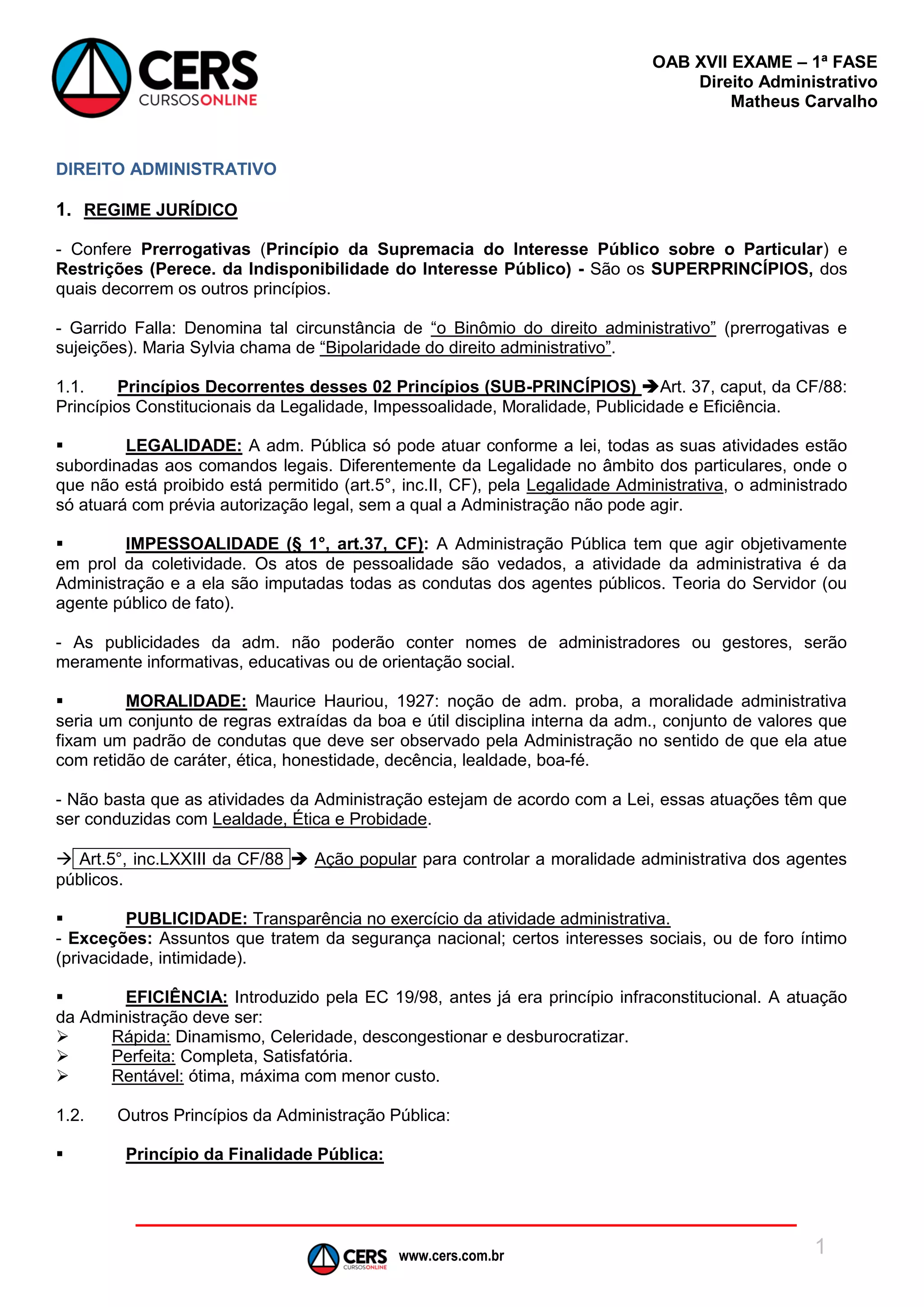 O documento discute os principais conceitos de Direito Administrativo brasileiro, incluindo os regimes jurídicos, princípios, poderes administrativos e outros tópicos. Em particular, define os princípios da legalidade, impessoalidade, moralidade, publicidade e eficiência como decorrentes dos superprincípios da supremacia do interesse público e da indisponibilidade deste interesse. Também explica os poderes administrativos de forma vinculada, discricionária e hierárquica.