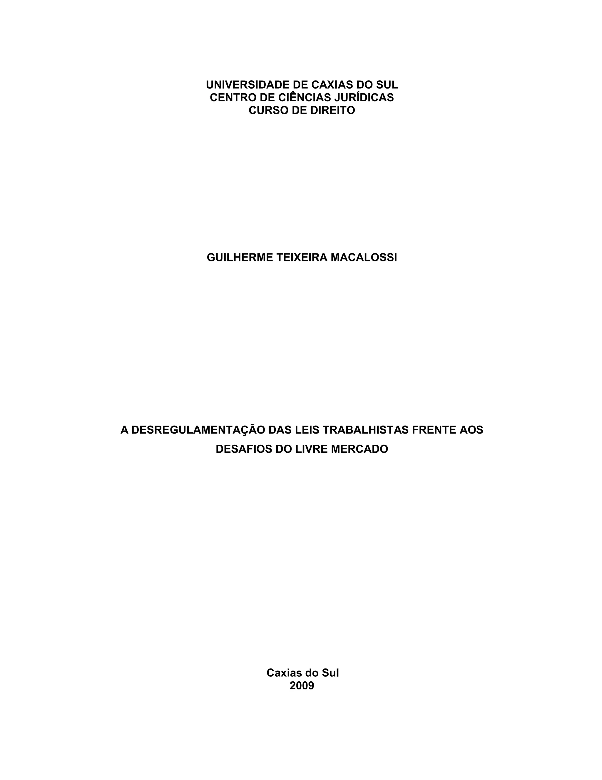Este documento é uma monografia apresentada por Guilherme Teixeira Macalossi para obtenção do título de bacharel em Direito pela Universidade de Caxias do Sul em 2009. A monografia defende a desregulamentação das leis trabalhistas brasileiras frente aos desafios do livre mercado. Ela discute a origem da legislação trabalhista no Brasil, exemplos de flexibilização em outros países, mitos sobre a intervenção estatal e o papel dos sindicatos. O objetivo é propor uma legislação trabalhista mais liberal que