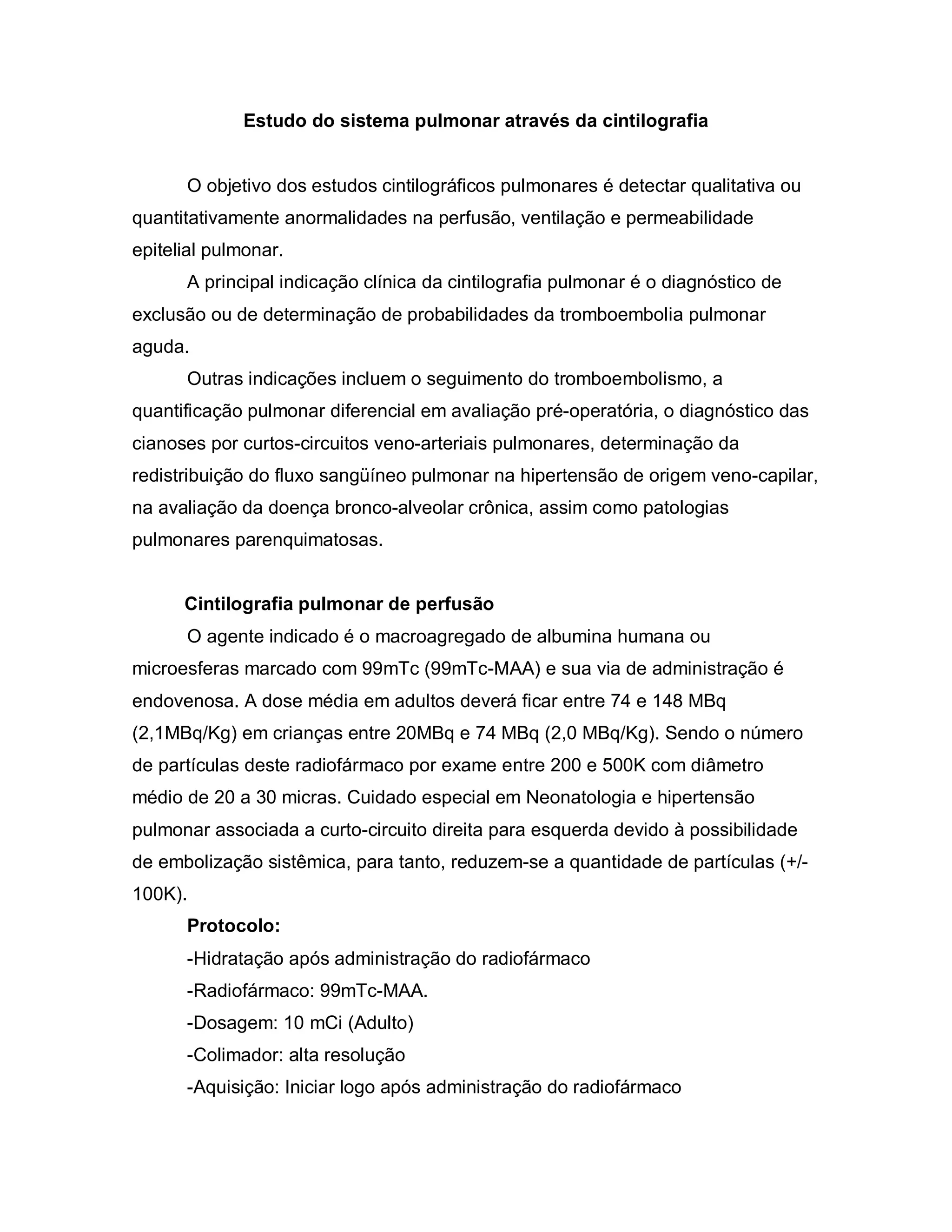 O documento discute o uso da cintilografia pulmonar para detectar anormalidades na perfusão, ventilação e permeabilidade do pulmão. A cintilografia de perfusão usa 99mTc-MAA para visualizar o fluxo sanguíneo pulmonar, enquanto a cintilografia de ventilação usa 99mTc-DTPA para visualizar a ventilação pulmonar. As imagens podem ajudar no diagnóstico de condições como tromboembolismo pulmonar.