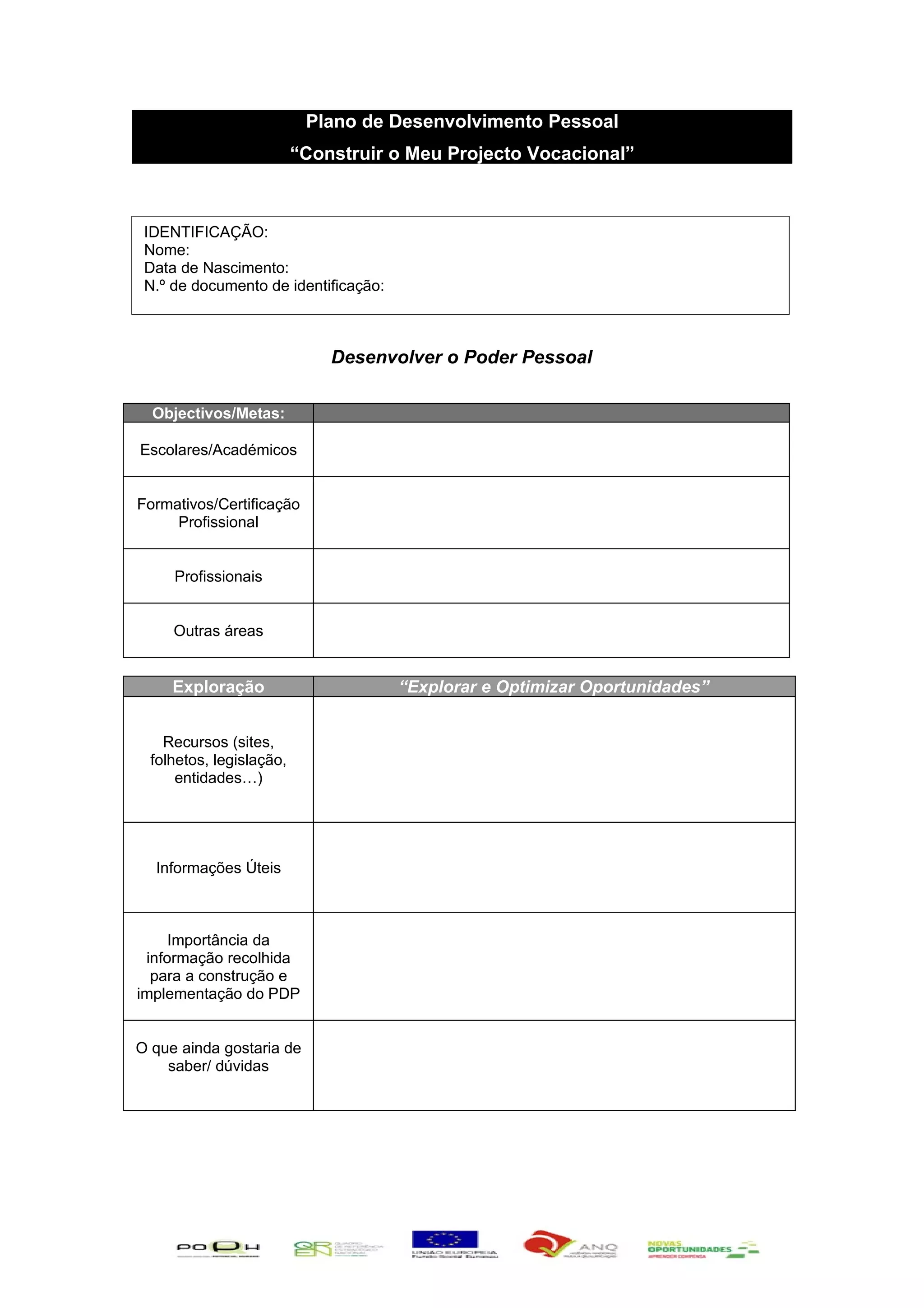 This document outlines a personal development plan, including objectives in academic, professional certification, and personal development areas. It identifies necessary resources and information to construct and implement goals, and provides space for an evaluation team to provide feedback and signatures.