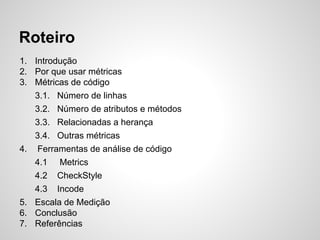 O documento discute métricas e visualização de código. Ele explica o que são métricas de código e como podem ser usadas para avaliar a qualidade e legibilidade do código. Ele também lista vários tipos de métricas e ferramentas para análise de código, além de fornecer exemplos de escalas de medição para métricas como LOC, AMLOC e ACCM.