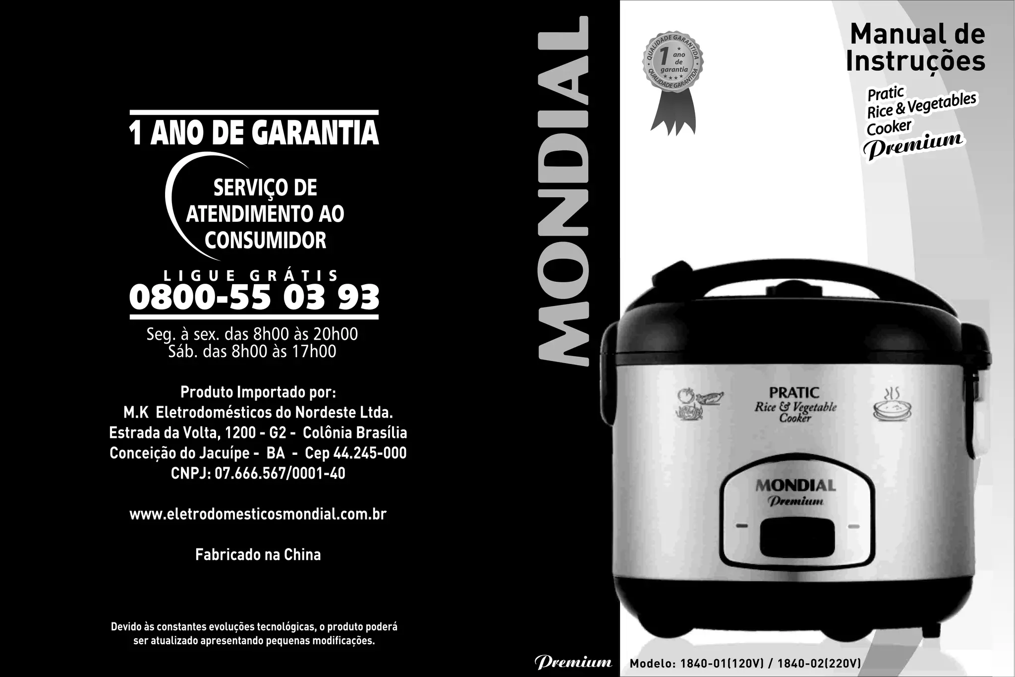 [1] O documento fornece instruções de uso e advertências de segurança para uma panela elétrica Pratic Rice & Vegetables Premium. [2] Ele explica como usar as funções de cozinhar e aquecer da panela e fornece dicas para o uso correto do produto. [3] O manual também lista características e especificações do produto e instruções de limpeza antes do primeiro uso.