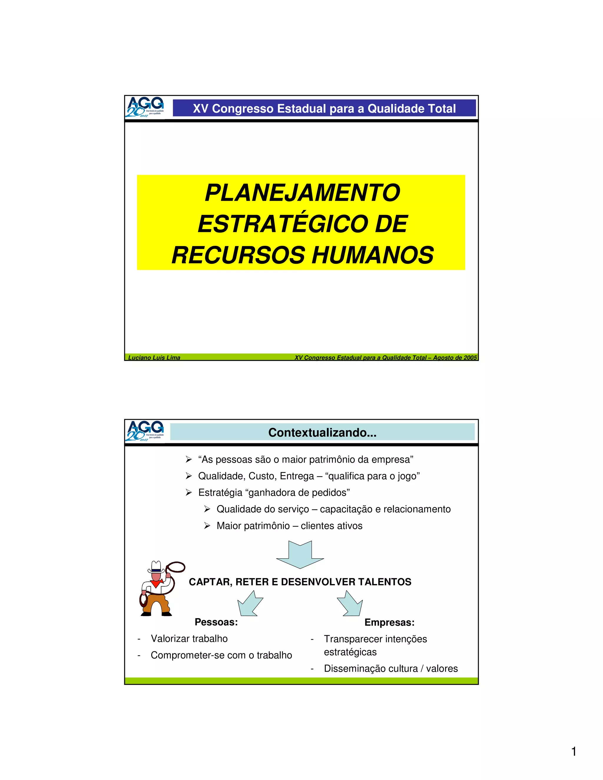 O documento discute o planejamento estratégico de recursos humanos no contexto do XV Congresso Estadual para a Qualidade Total. Aborda tópicos como a evolução da função de RH, o papel dos recursos humanos na estratégia empresarial, os desafios atuais da área e a necessidade de alinhar as políticas de RH às diretrizes organizacionais. Também discute o perfil do profissional de RH estratégico e a importância do planejamento estratégico de recursos humanos para a gestão de pessoas.