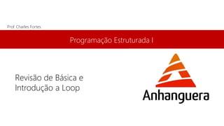 O documento apresenta as slides de uma aula sobre Programação Estruturada I ministrada pelo professor Charles Fortes. A aula inclui uma revisão de conceitos básicos e introdução a loops, com explicações sobre compiladores, blocos de código, funções básicas, tipos de dados, estruturas if-else e loops como for, while e do-while.