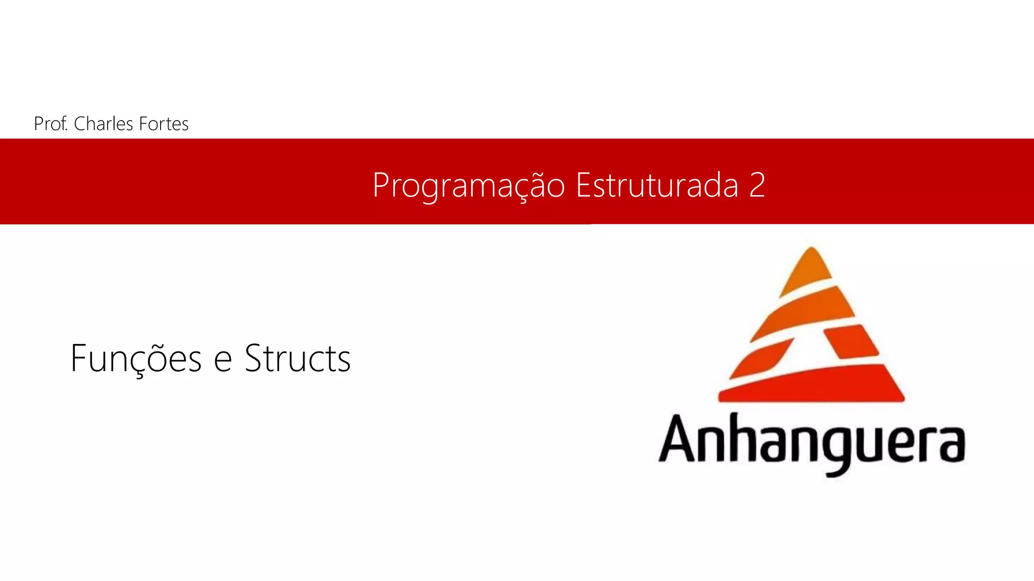 Este documento apresenta informações sobre Charles Fortes, professor de Programação Estruturada 2. Ele discute sobre funções e structs em C, e inclui slides sobre módulos de programas, protótipos de funções, parâmetros por valor e referência, e introdução a estruturas.