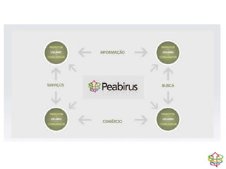 O documento descreve o Peabirus, uma plataforma de rede social focada no agronegócio. O Peabirus conecta profissionais do setor com consumidores e jornalistas, permitindo a divulgação de produtos, serviços e conhecimento sobre o agronegócio. Criado em 2006, o Peabirus tem mais de 20 mil usuários cadastrados e 2 milhões de páginas visualizadas no último ano.