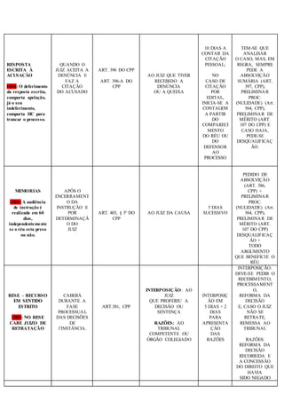 O documento lista diversas peças processuais penais utilizadas antes, durante e depois do processo, indicando seu cabimento, fundamentação legal, prazo e endereçamento. São descritas peças como pedido de relaxamento de prisão em flagrante, requerimento de liberdade provisória, queixa-crime, resposta escrita à acusação, memoriais, recursos em sentido estrito, apelação, embargos de declaração, recursos especial e extraordinário, agravo de instrumento, revisão criminal e habeas corpus.