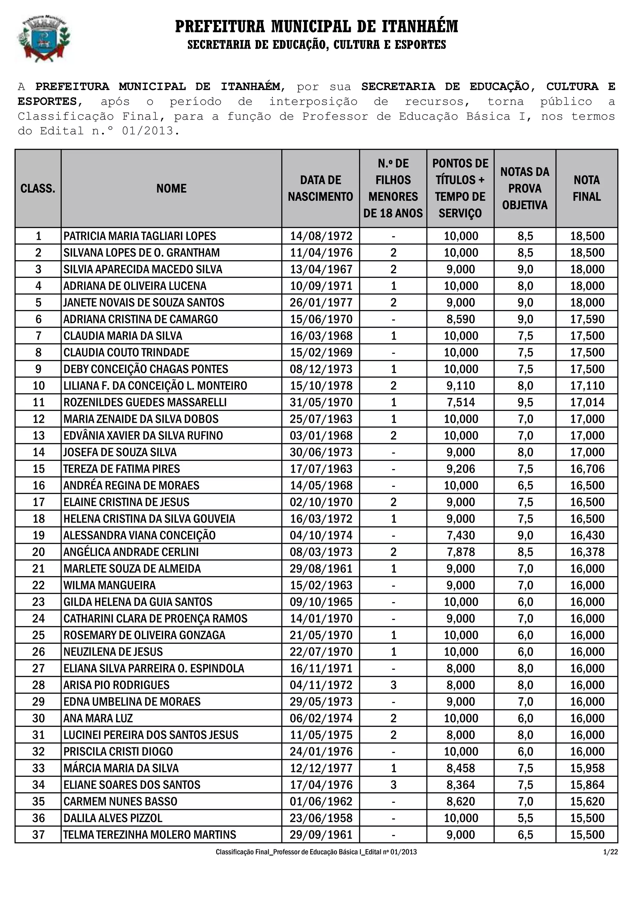 PREFEITURA MUNICIPAL DEITANHAÉM SECRETARIA DE EDUCAÇÃO, CULTURA E ESPORTES A PREFEITURA MUNICIPAL DE ITANHAÉM, por sua SECRETARIA DE EDUCAÇÃO, CULTURA E ESPORTES, após o período de interposição de recursos, torna público a Classificação Final, para a função de Professor de Educação Básica I, nos termos do Edital n.º 01/2013. N.º DE PONTOS DE NOTAS DA DATA DE FILHOS TÍTULOS + NOTA CLASS. NOME PROVA NASCIMENTO MENORES TEMPO DE FINAL OBJETIVA DE 18 ANOS SERVIÇO 482 CINTHIA THAÍS AMBRÓSIO S. DA SILVA 08/03/1989 - 0,000 7,0 7,000 483 TATIANA DA SILVA LUCAS 09/06/1989 - 0,000 7,0 7,000 484 JULIANA GONÇALVES DE SOUZA PINHEIRO 07/08/1990 - 0,000 7,0 7,000 485 ANGELA DE CASTRO MIGUEL 25/05/1991 - 0,000 7,0 7,000 486 PRISCILA DONATO DE CARVALHO 20/05/1992 - 0,000 7,0 7,000 487 LETICIA VIEIRA DÓRIA M. DE ABREU 26/09/1992 - 0,000 7,0 7,000 488 TAWANE KRISTINE DA SILVA 14/10/1992 - 0,000 7,0 7,000 489 DEUSTIDI MARIA DA SILVA 01/06/1961 1 1,932 5,0 6,932 490 FLÁVIA DA SILVA RAMOS 11/11/1975 2 0,920 6,0 6,920 491 GRAZIELA MESSIAS GONÇALVES 10/02/1984 - 1,906 5,0 6,906 492 MARIA DE LOURDES SUZANO 17/03/1954 - 1,848 5,0 6,848 493 JOSÉ CARLOS ZANAROLLI 13/03/1963 - 1,836 5,0 6,836 494 GABRIELA MEDEIROS CASTRO 20/03/1987 1 0,762 6,0 6,762 495 JOÃO CESAR HENRIQUE R. MONTEIRO 07/08/1965 1 0,198 6,5 6,698 496 DENISE APARECIDA RODRIGUES SILVA 23/04/1986 1 0,178 6,5 6,678 497 ANA PAULA SANTOS DO NASCIMENTO 23/12/1984 - 1,150 5,5 6,650 498 FABIANA COSTA RAMOS MEROLLA 10/08/1978 1 3,610 3,0 6,610 499 TATIANE MENDES 17/04/1984 - 0,042 6,5 6,542 500 THAÍS LAGE PORTO 01/06/1972 - 3,020 3,5 6,520 501 MARLI CONCEIÇÃO GONZAGA CAMARGO 08/12/1956 - 0,000 6,5 6,500 502 MARIA APARECIDA BISPO 06/09/1958 - 0,000 6,5 6,500 503 TANIA BARROSO CORONA MEDEIROS 27/03/1961 1 0,000 6,5 6,500 504 MARILENE ROSA DE CARVALHO 20/08/1966 - 0,000 6,5 6,500 505 SILMARA ALVES DO NASCIMENTO 18/07/1969 - 1,000 5,5 6,500 506 MARILUCIA CASTILHO GOMES 28/10/1969 - 1,000 5,5 6,500 507 SANDRA BARROS DE CERQUEIRA 29/12/1969 2 0,000 6,5 6,500 508 MARIA SANTÍLIA SOUSA DE CARVALHO 16/04/1970 - 0,000 6,5 6,500 509 NELMA APARECIDA MARIANO 15/07/1970 - 0,000 6,5 6,500 510 ANDRÉA MENEZES DA SILVA 04/08/1970 - 0,000 6,5 6,500 511 MARCIA REGINA BRONZATTO PALOMO 30/12/1970 2 0,000 6,5 6,500 512 ANDRÉA ESCOBAR MOURA 22/01/1972 - 0,000 6,5 6,500 513 JOSEFA MARIA DOS SANTOS 05/09/1972 2 0,000 6,5 6,500 514 SORAYA JAHNKE 13/09/1974 2 0,000 6,5 6,500 515 MARILUCIA FERREIRA BATISTA 08/09/1975 1 0,000 6,5 6,500 516 CLEIDIMAR MARIA BATISTA BONFIM 24/12/1975 1 0,000 6,5 6,500 517 MARLENE OLIVEIRA DA SILVA 24/06/1976 1 0,000 6,5 6,500 518 MARIA SUZANA MACIEL DE S. SILVA 05/08/1976 1 1,000 5,5 6,500 Classificação Final_Professor de Educação Básica I_Edital nº 01/2013 14/22