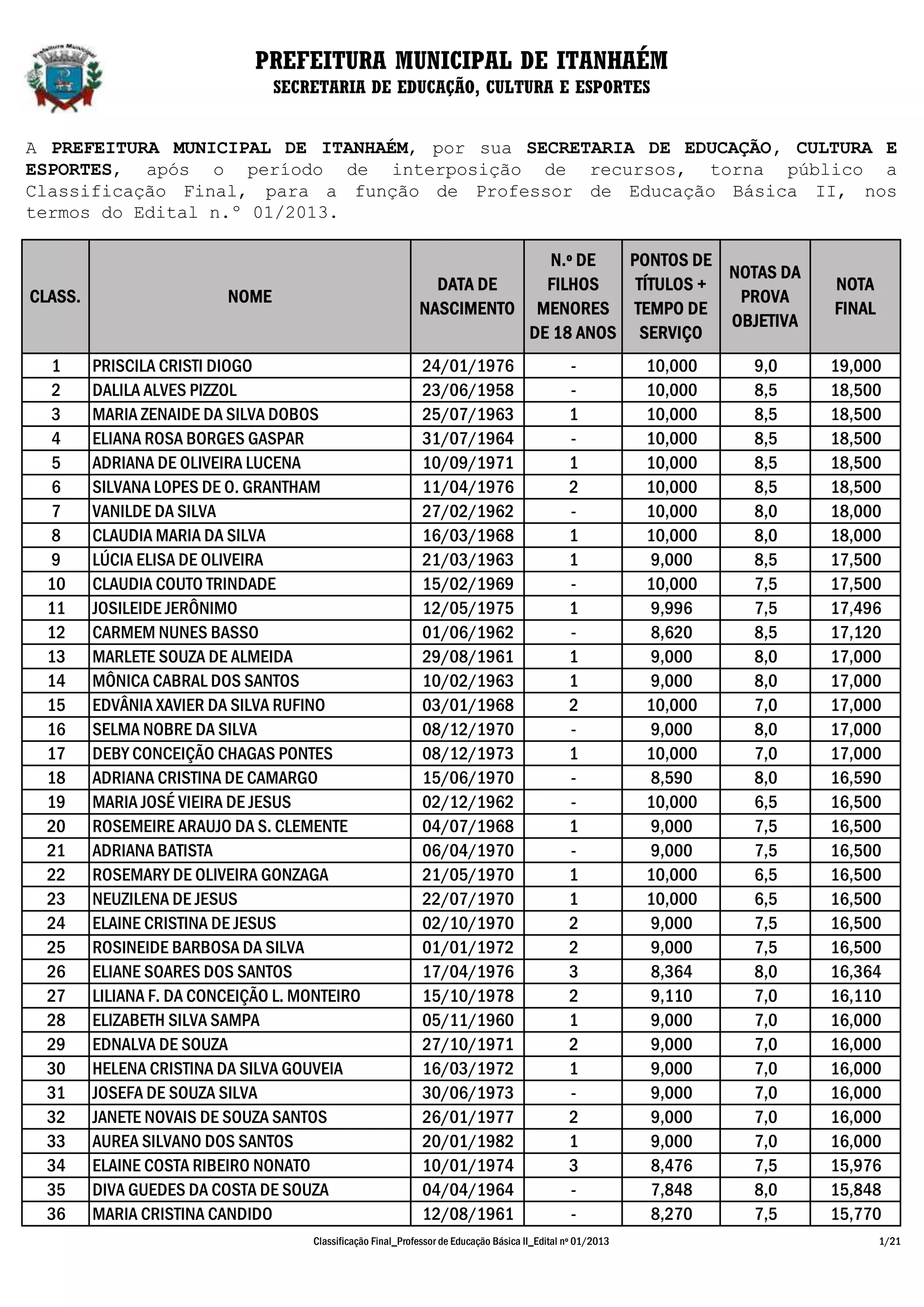 O documento apresenta a classificação final de candidatos para o cargo de Professor de Educação Básica II em uma prefeitura, listando o nome, data de nascimento, número de filhos menores de 18 anos, pontos de títulos e tempo de serviço, nota da prova objetiva e nota final de cada candidato.