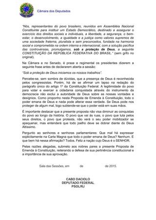 A proposta de emenda à constituição declara que todo o poder emana de Deus. Isso seria feito alterando o parágrafo único do artigo 1o da constituição para incluir que todo o poder emana diretamente de Deus ou por meio do povo e seus representantes eleitos. O autor argumenta que a bíblia e a própria constituição já reconhecem a autoridade de Deus, e que expressar isso explicitamente na constituição não traria mal, apenas bem.