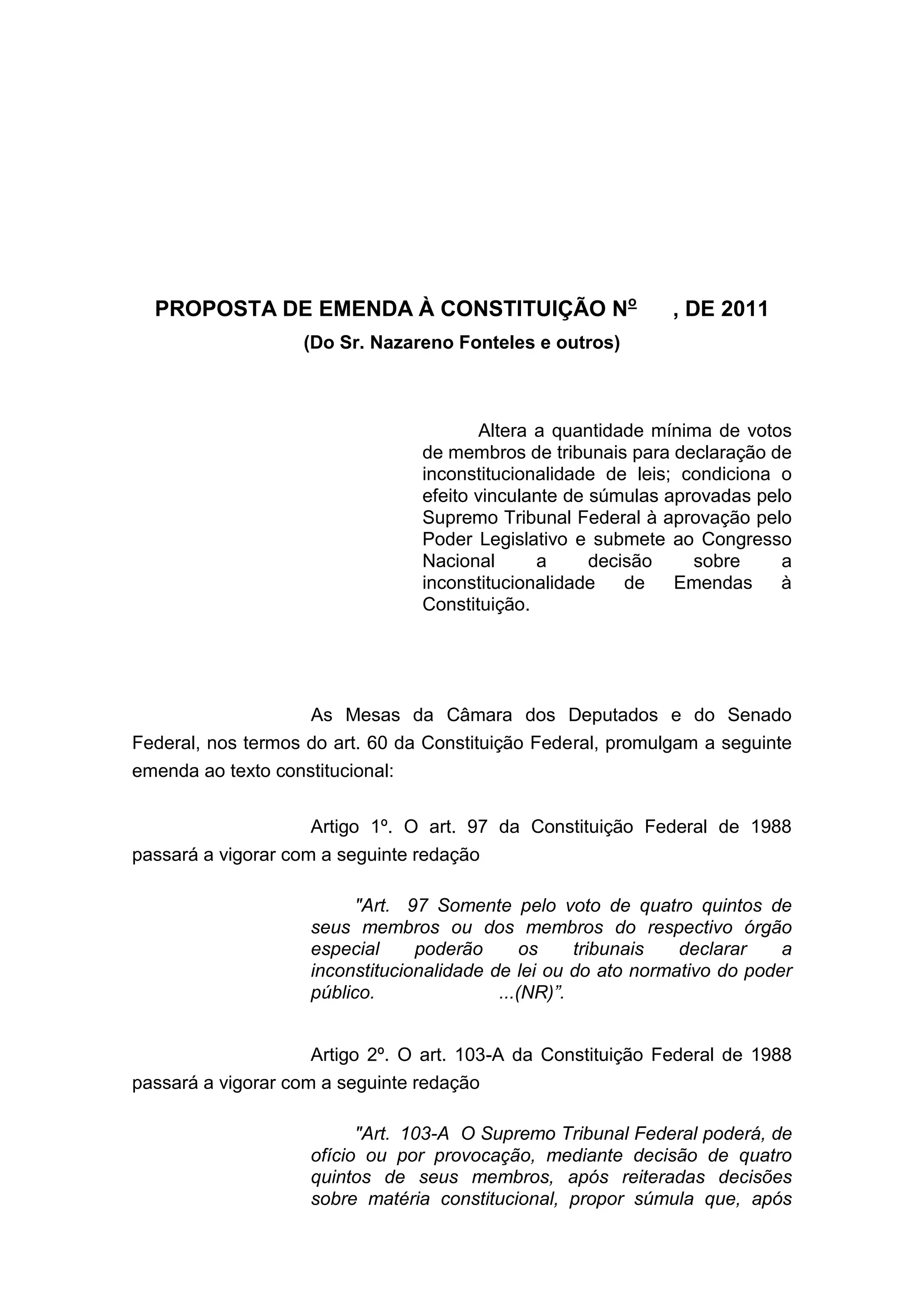 1) A proposta altera a quantidade mínima de votos necessários para tribunais declararem leis inconstitucionais, exigindo 4/5 dos membros.