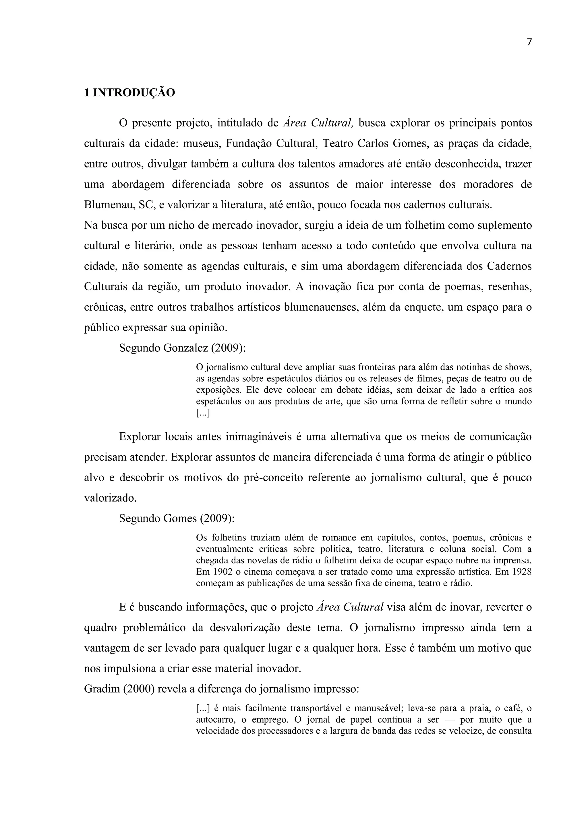 O documento discute a proposta de criação de um suplemento cultural e literário para a cidade de Blumenau, SC. O objetivo é (1) valorizar a cultura e os artistas locais, (2) fornecer informações sobre diversas vertentes culturais da cidade para além de agendas culturais, e (3) promover o jornalismo cultural de forma inovadora.