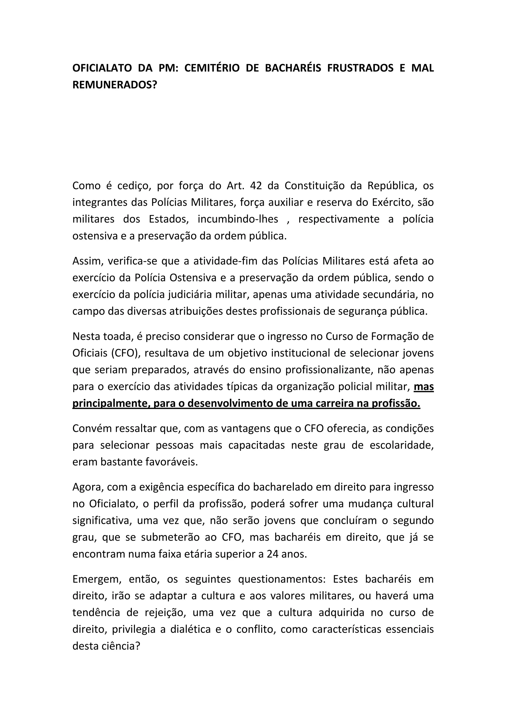 O documento discute se o oficialato da PM se tornou um "cemitério de bacharéis frustrados e mal remunerados" após exigir um diploma de bacharel em direito para ingresso. Argumenta que bacharéis em direito podem não se adaptar à cultura militar e ser atraídos por carreiras jurídicas melhores remuneradas, tornando o oficialato da PM uma opção temporária.