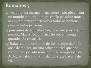 O documento discute a doutrina do pecado original e sua relação com a graça de Deus. Ele afirma que (1) o pecado e a morte entraram no mundo por causa do pecado de Adão e que (2) todos pecaram e são culpados, mesmo aqueles que viveram antes da lei de Moisés; (3) no entanto, a graça de Deus por meio de Cristo é muito maior que as consequências do pecado de Adão.