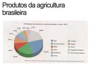 O documento resume os principais produtos da agricultura e da pecuária no Brasil, incluindo café, cana-de-açúcar, laranja, soja, algodão, arroz, milho, trigo e bovinos. Destaca que o Brasil é o maior produtor e segundo maior consumidor de café, bem como um dos maiores produtores mundiais de açúcar, soja, frango e bovinos.