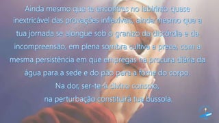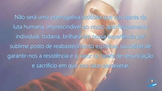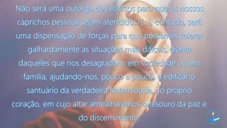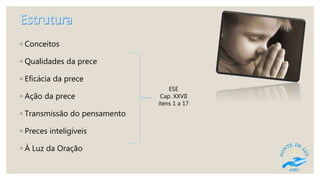 Este documento discute conceitos e qualidades da prece, incluindo sua eficácia e ação. Explica que a prece é um ato de adoração a Deus e que podemos louvar, pedir e agradecer por meio da prece. Também ressalta que a prece efetiva vem do coração sincero e não de palavras mecânicas.