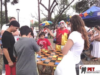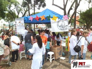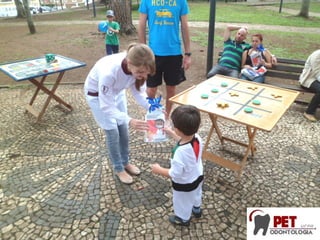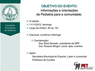 O documento descreve um evento chamado "Pediatria na Praça" que teve como objetivo fornecer informações e orientações sobre pediatria para a comunidade. O evento ocorreu em 11 de novembro de 2012 em três cidades e abordou temas como alimentação saudável, prevenção da obesidade infantil e importância das consultas pediátricas. O planejamento do evento envolveu reuniões com a Liga de Pediatria para discutir os detalhes e preparar os materiais.