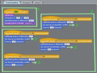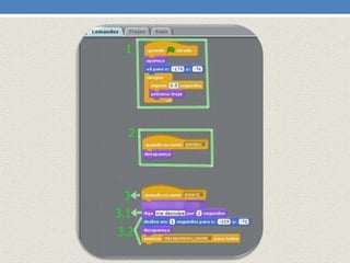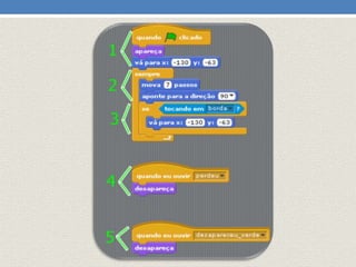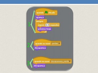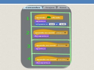 Este documento fornece instruções passo-a-passo para criar um jogo no Scratch sobre poluição ambiental. Inclui comandos para criar cenário, personagens e suas interações, como um personagem que coleta lixo jogado por outros antes que perca todas as vidas.
