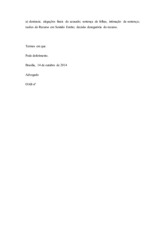 Este documento é uma carta testemunhável interposta por um advogado após ter seu recurso em sentido estrito denegado. O advogado pede que o recurso seja processado e conhecido pelo Tribunal de Justiça, alegando que o crime prescreveu. Ele solicita o envio de documentos como a denúncia, alegações finais, sentença e razões do recurso ao tribunal.