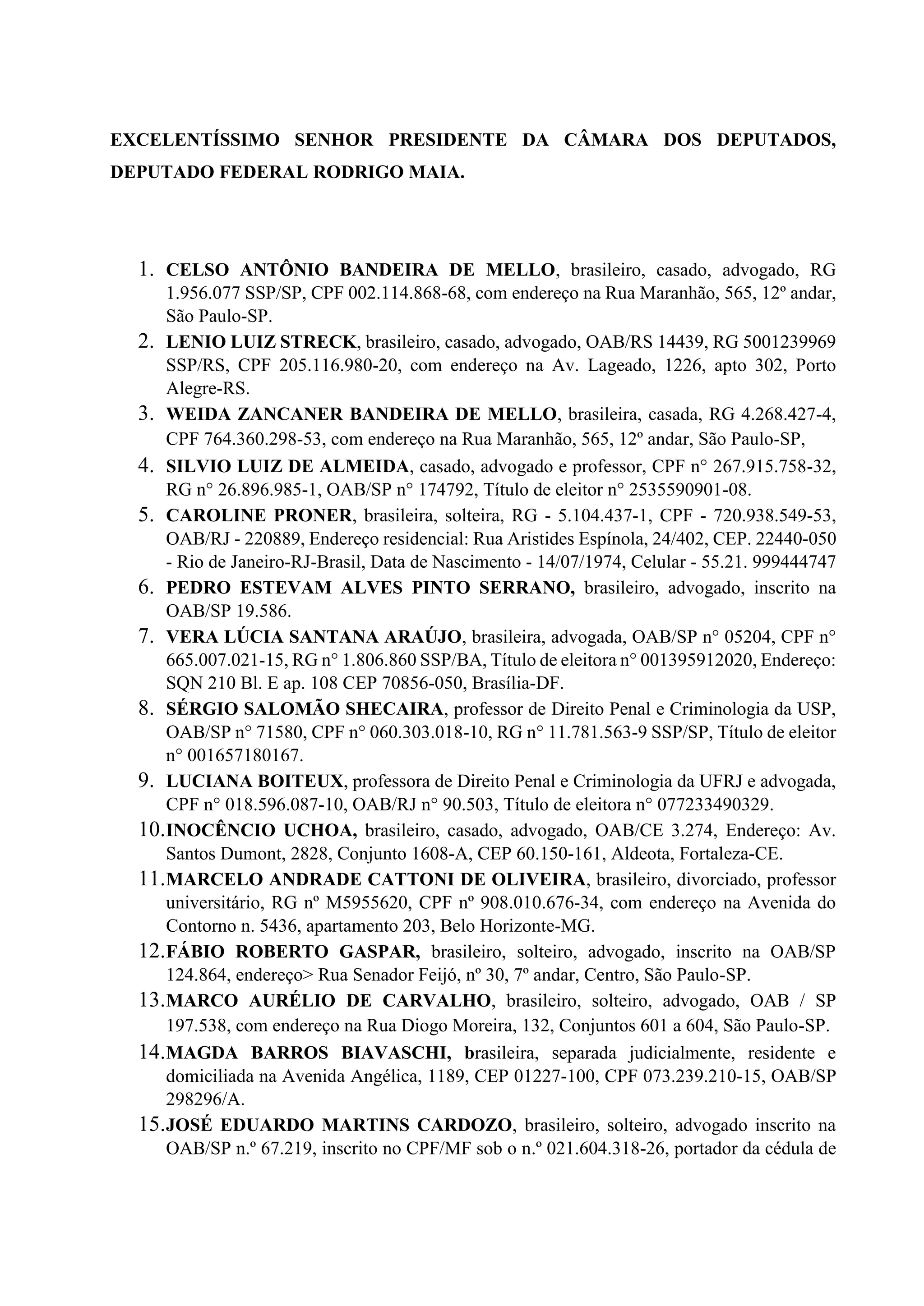 O documento apresenta 54 nomes de advogados, professores e defensores públicos com seus respectivos dados pessoais como nome, estado civil, número de inscrição na OAB, CPF e endereço. O documento parece ser uma lista de assinaturas em apoio a alguma causa ou petição.