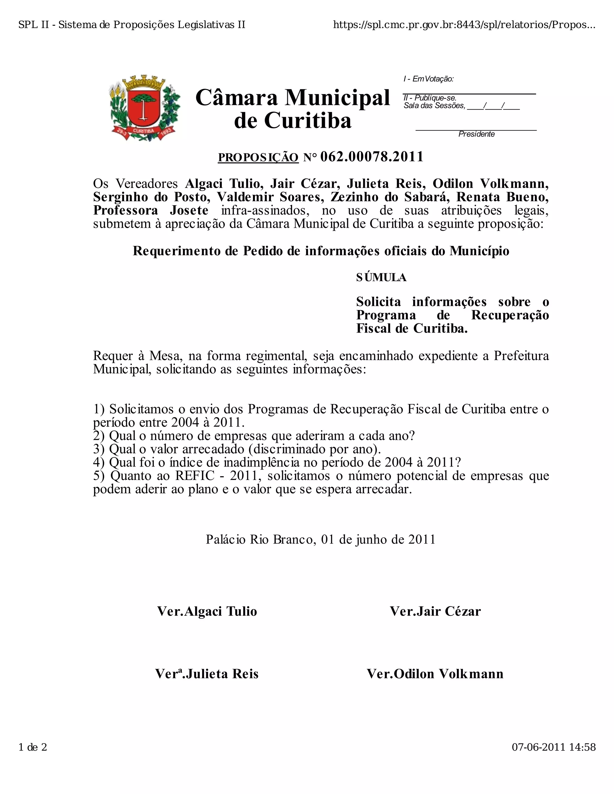 O documento é um requerimento de pedido de informações oficiais enviado à Câmara Municipal de Curitiba por nove vereadores. Eles solicitam informações sobre o Programa de Recuperação Fiscal de Curitiba entre 2004 e 2011, incluindo número de empresas participantes, valores arrecadados e índice de inadimplência.