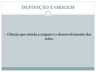 Pedologia é a ciência que estuda a origem e desenvolvimento dos solos. Os solos formam-se através de processos de pedogênese e apresentam horizontes que diferenciam suas características. Os principais fatores de formação dos solos são clima, relevo, tempo e rocha de origem. Existem diferentes classificações de solos e problemas como erosão podem afetar sua qualidade.