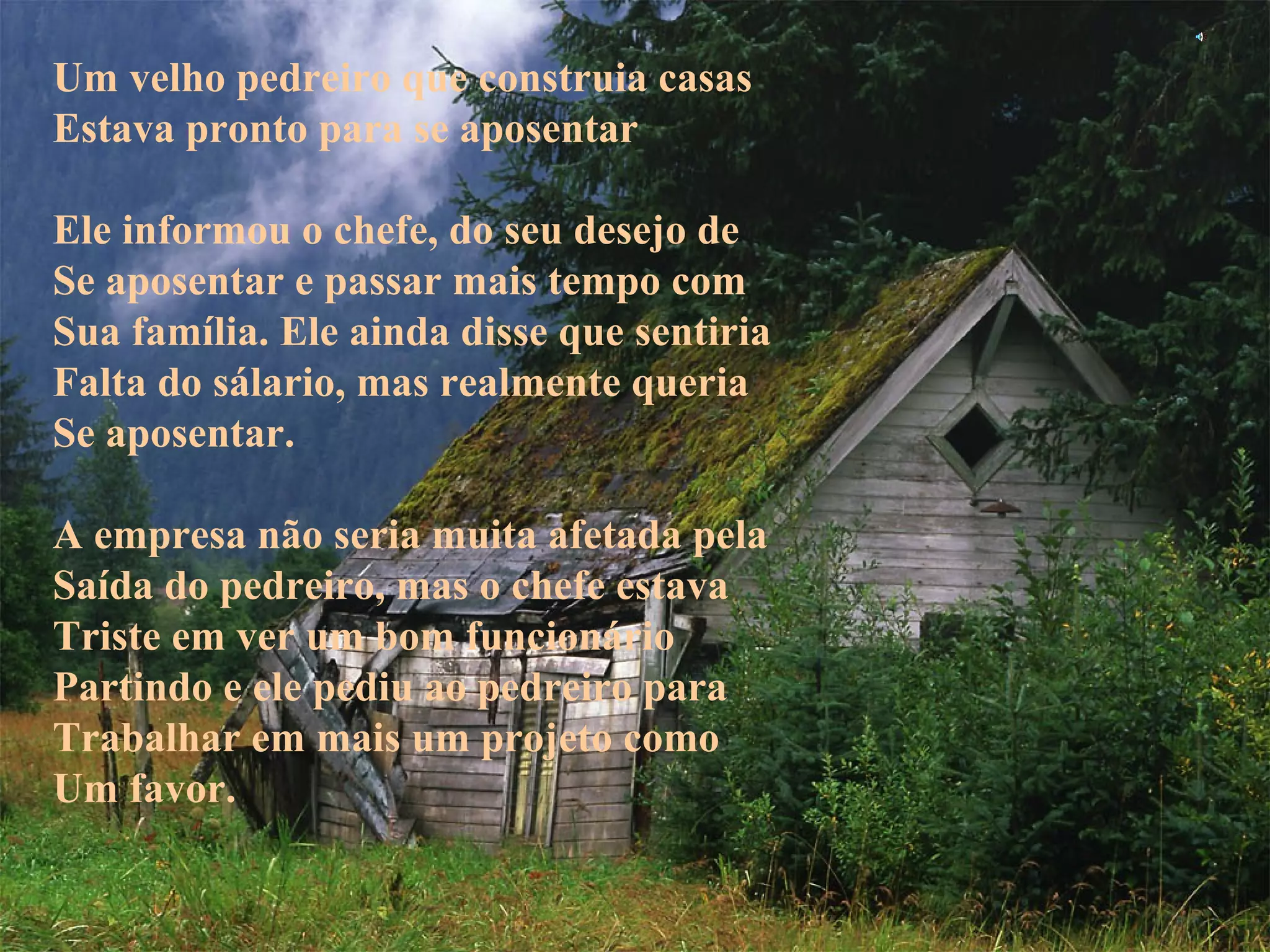 Um pedreiro queria se aposentar, mas concordou em fazer mais um projeto a pedido do chefe. Ele construiu a casa com materiais inadequados. Quando terminou, o chefe deu a casa ao pedreiro como presente de aposentadoria. Da mesma forma, construímos nossas vidas dia a dia sem saber o resultado final.