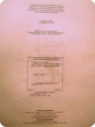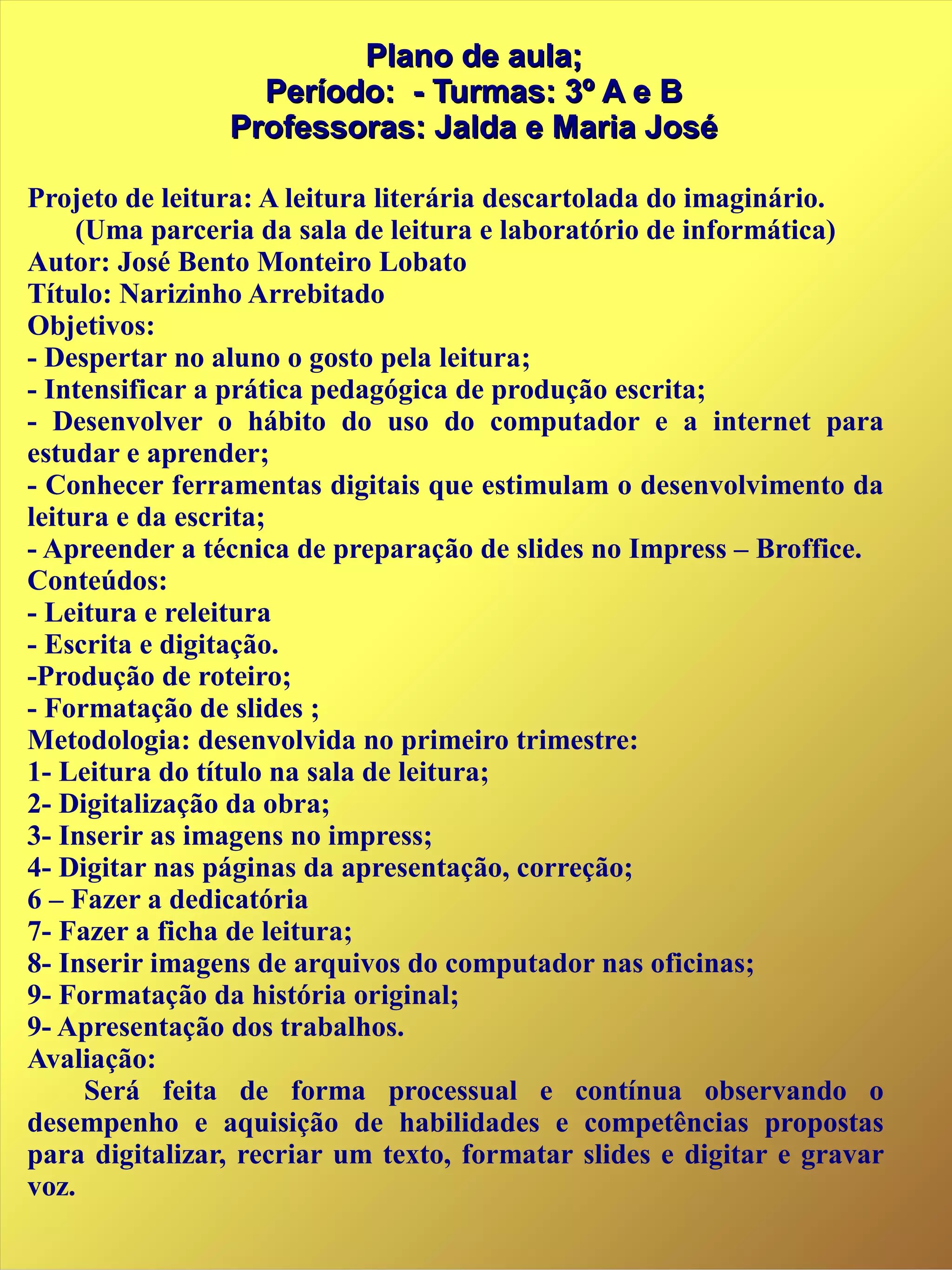 Este plano de aula descreve um projeto de leitura e produção digital sobre o livro "Narizinho Arrebitado" de Monteiro Lobato. Os objetivos são despertar o gosto pela leitura, desenvolver habilidades de escrita e uso de ferramentas digitais. As atividades incluem leitura, produção de resumos, slides e apresentações digitais da história. A avaliação será processual, observando o desempenho dos alunos.