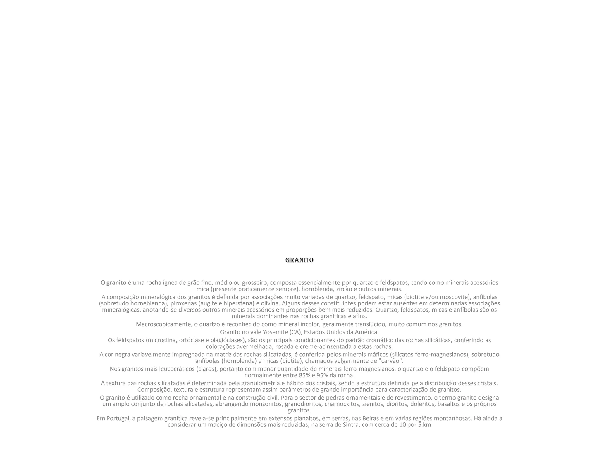 O granito é uma rocha ígnea composta principalmente por quartzo e feldspatos, com minerais acessórios como mica. Sua cor e textura dependem da proporção e distribuição desses minerais. É amplamente usado como pedra ornamental e na construção civil em Portugal, onde grandes áreas do país apresentam paisagens graníticas.