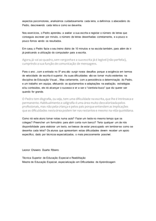 O documento descreve as dificuldades de escrita de Pedro desde tenra idade, incluindo desenhar letras e organizar o texto. Após avaliação, foi diagnosticado com disgrafia. Recebeu apoio especializado focado em aspectos psicomotores e definir cada letra, melhorando gradualmente, embora ainda não perfeito.