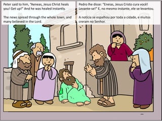 Pedro visita a cidade de Lida e encontra Aeneas, um paralítico que estava paralisado há oito anos. Ele cura Aeneas ao dizer 'Jesus Cristo cura você! Levante-se!', e Aeneas se levanta instantaneamente. A cura gera grande repercussão na cidade, resultando em muitos novos crentes.