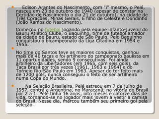 Pelé nasceu em 1940 em Minas Gerais e começou a jogar futebol em times amadores de São Paulo. Ele teve grande sucesso pelo Santos, conquistando mais de 40 títulos, incluindo vários campeonatos paulistas. Na seleção brasileira, estreou aos 16 anos e tornou-se o jogador mais jovem a vestir a camisa do Brasil. Encerrou a carreira no Santos em 1974, mas voltou a jogar no ano seguinte pelo Cosmos de Nova York.