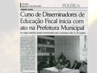 O documento descreve o Programa Nacional de Educação Fiscal do Brasil, que tem como objetivo promover a conscientização dos cidadãos sobre seus direitos e deveres tributários e o papel do Estado. O programa busca capacitar a população por meio de seminários, palestras, cursos a distância e materiais educativos distribuídos em escolas, universidades e para servidores públicos.