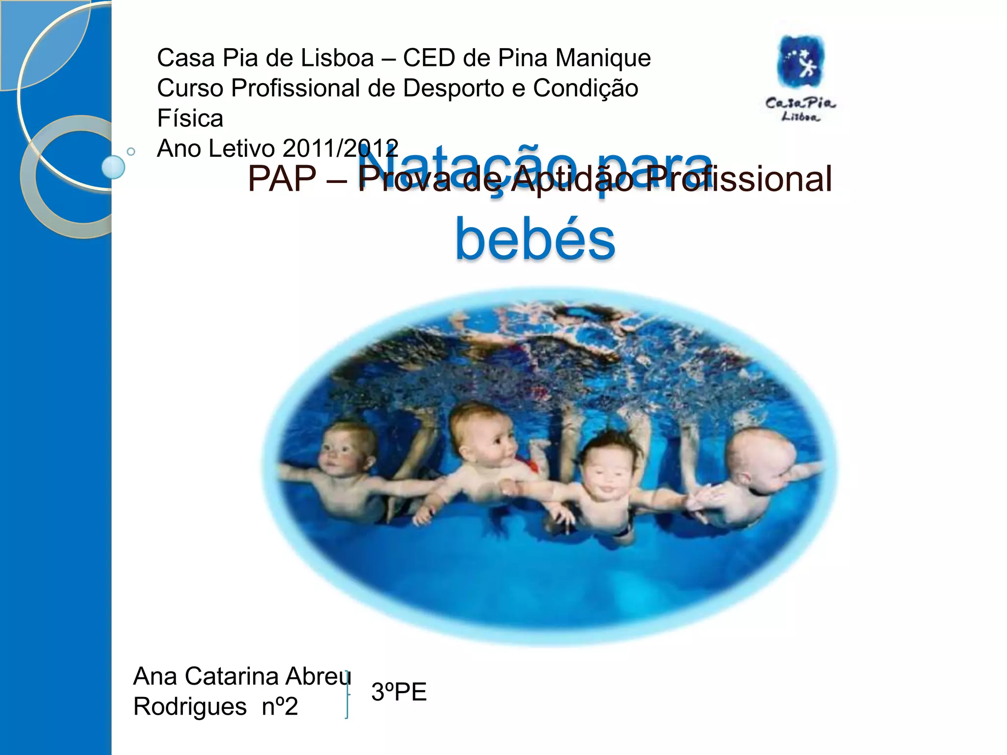 Este documento descreve técnicas e exercícios para introduzir bebés à natação. Apresenta seis tipos de pegas para segurar o bebé com firmeza, calma e segurança, e quatro grupos de exercícios focados em esperar, equilíbrio, atividades e passagens para familiarizar a criança com a água de forma segura e divertida.