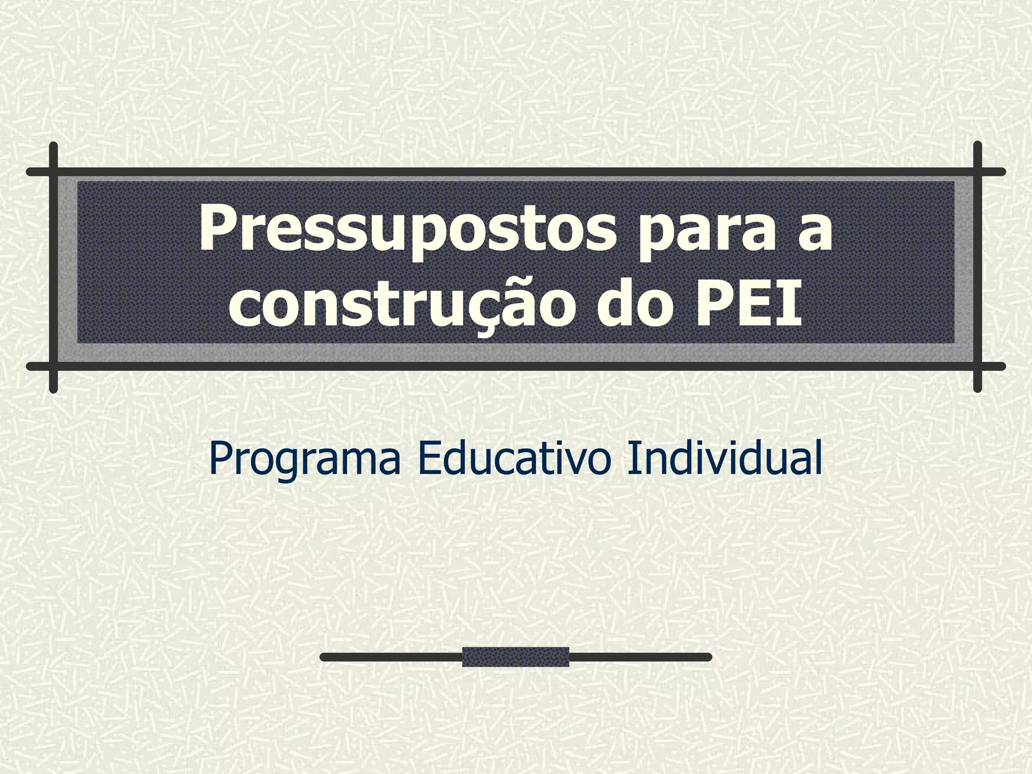 O documento descreve os pressupostos para a construção de um Programa Educativo Individual (PEI). O PEI é um documento importante para alunos com Necessidades Educativas Especiais permanentes e todos os envolvidos no seu processo educativo. Ele deve ser construído para atender às necessidades específicas de cada aluno e garantir equidade educativa.