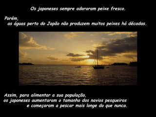 Os japoneses gostam de peixe fresco, mas tinham dificuldade em obter peixe fresco devido à distância das águas de pesca. Empresas de pesca experimentaram congelamento e tanques em navios, mas os peixes perdiam o sabor fresco. A solução foi colocar tubarões nos tanques para manter os peixes ativos e chegarem frescos ao Japão.