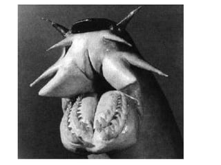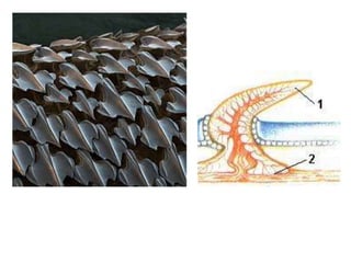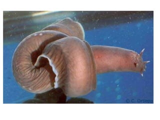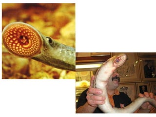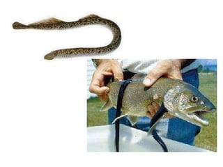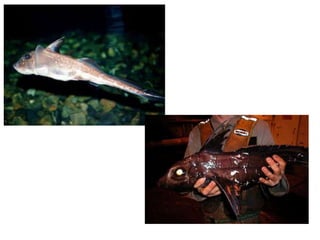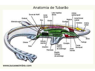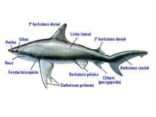 O documento descreve as características de três filos de peixes: Agnatha, Elasmobrânquios e Actinopterígios. Agnatha são peixes primitivos sem mandíbulas com corpo alongado e esqueleto cartilaginoso. Elasmobrânquios incluem tubarões e raias com escamas especializadas e esqueleto ósseo parcial. Actinopterígios são peixes ósseos com nadadeiras lobadas e brânquias protegidas por opérculos.