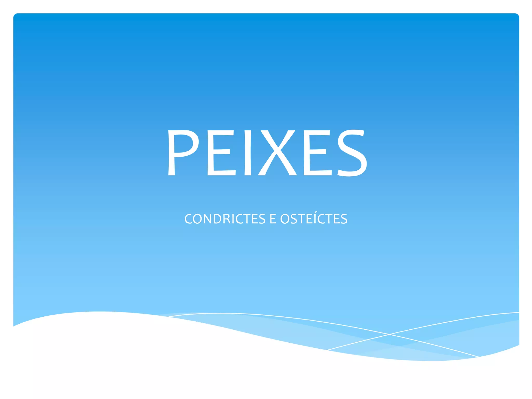 Os peixes evoluíram há 500 milhões de anos com os ostracodermos e 400 milhões de anos com os placodermos, que desenvolveram esqueleto ósseo há 250 milhões de anos. Existem duas classes principais de peixes: os condrictes, como tubarões, que possuem esqueleto cartilaginoso, e os osteíctes, como as sardinhas, que possuem esqueleto ósseo. Os peixes se locomovem com as nadadeiras e respiram através de brânquias.